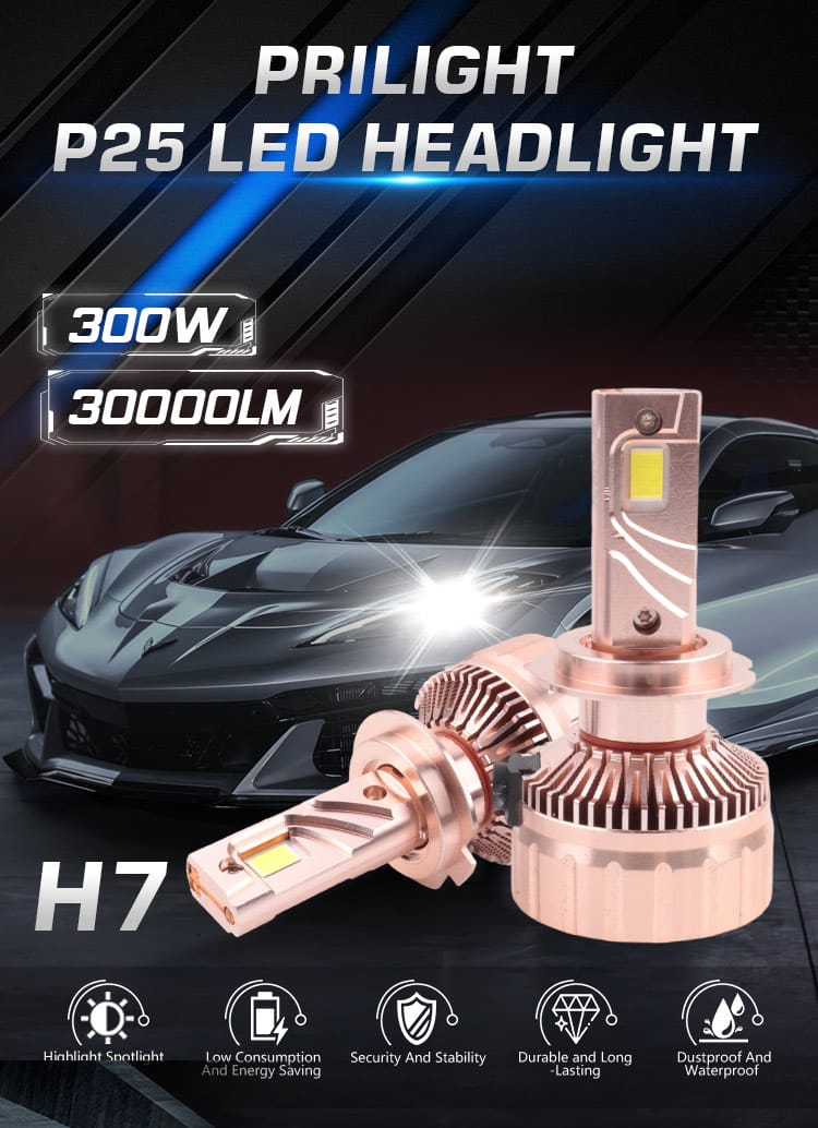 Prilight P25 H7 300W 30000LM 6500K Bombilla LED para faros delanteros del sistema de iluminación del automóvil